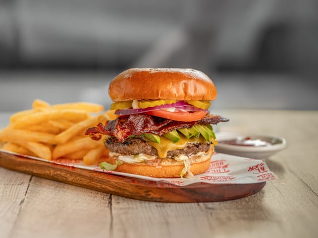 Angus beef patty with cheddar. Add toppings if you'd like.